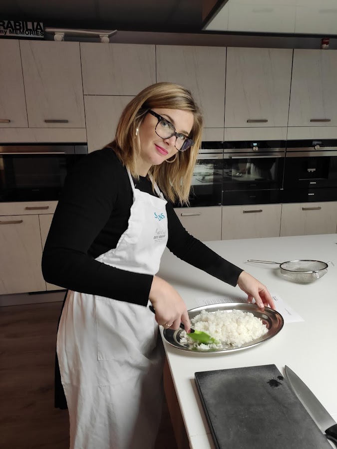 Una vez cocido retiramos el arroz del fuego, lo pasamos a una bandeja para que se enfríe. Aliñamos el arroz una vez esté templado, vamos poniendo poco a poco el vinagre y mezclando con una cuchara.