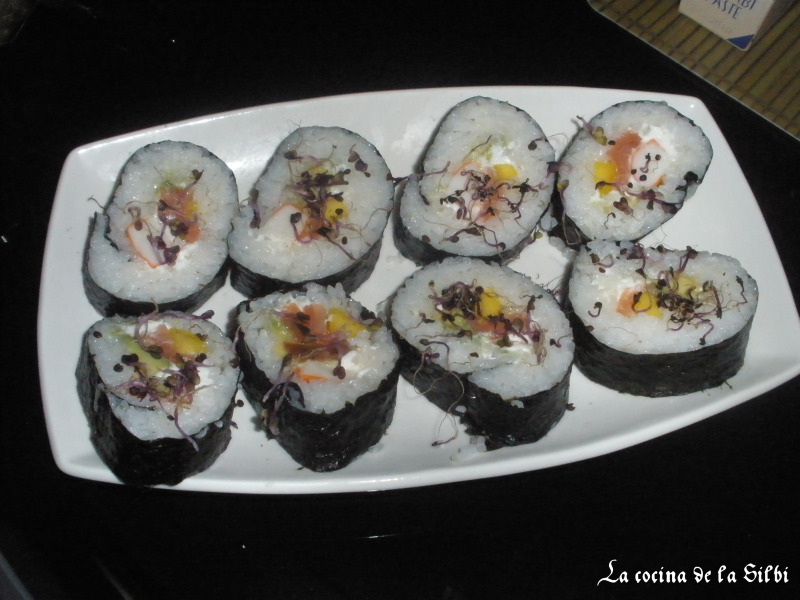 En el centro pondremos aguacate cortado en tiras, salmon ahumado, mango cortado en tiras, palito de cangrejo, y queso crema. Con cuidado y apretando, ayudandonos de la esterilla de bambú, vamos enrollando nuestro sushi. una vez listo, lo cortamos con la hoja del cuchillo mojada, y con cuidado en trozos.