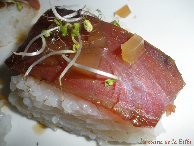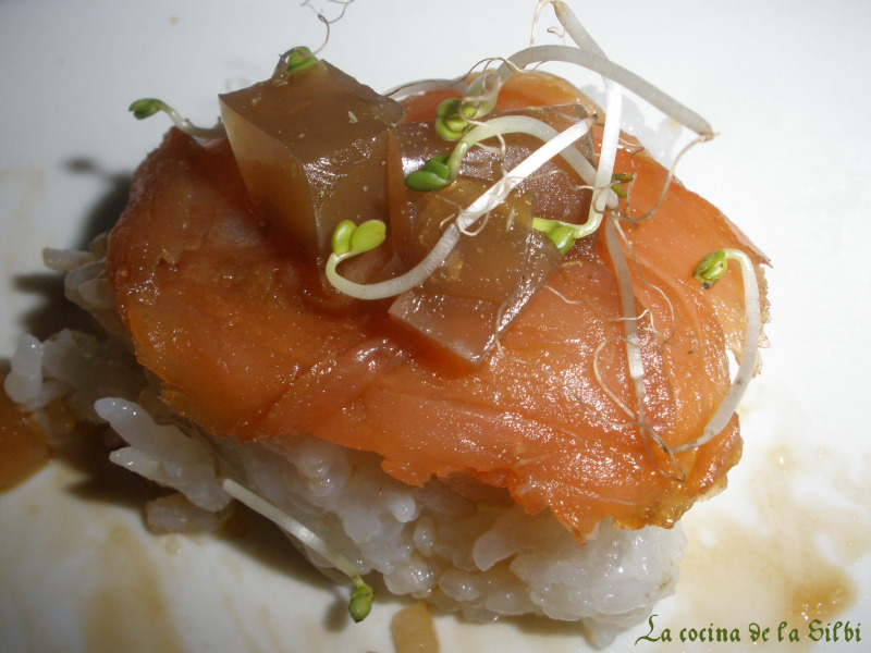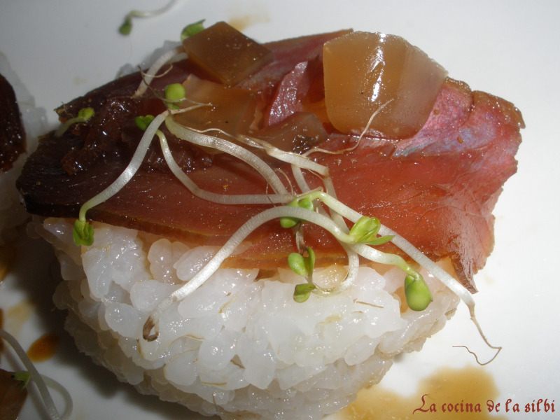 Los ponemos en un plato, escurrimos la mojama y el salmon, que teniamos en la soja con el wasabi y el gengibre, pondremos una loncha encima de cada montoncito de arroz, y decoraremos con la gelatina de te verde y germinados de brocoli.
