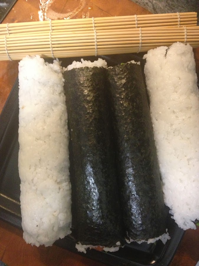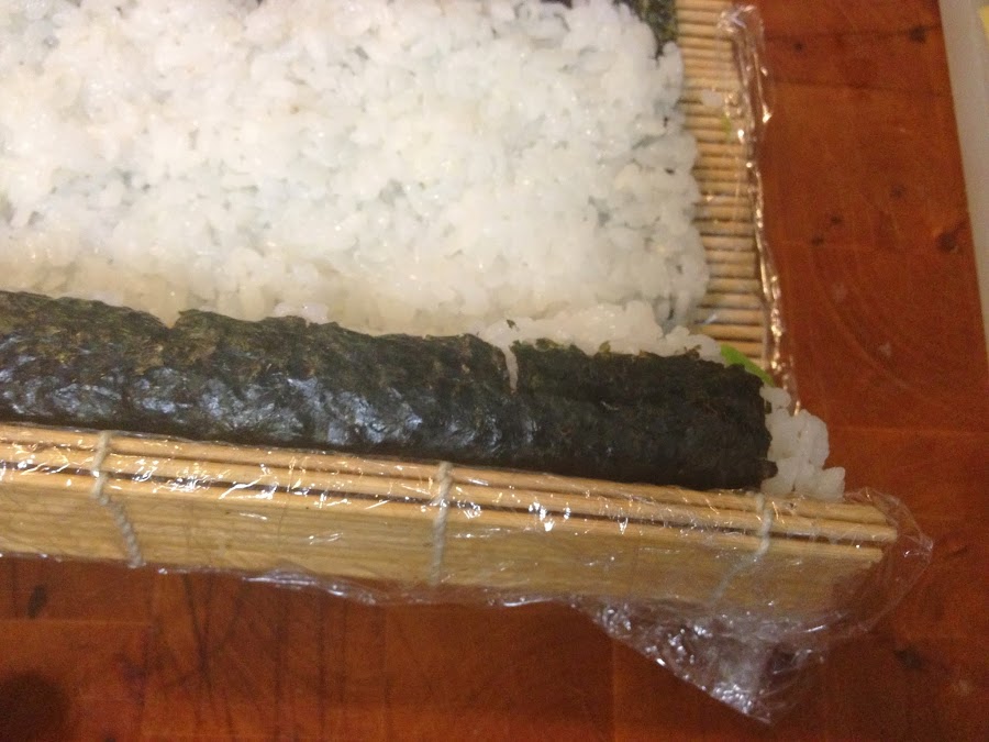 Como veréis en las fotos, además de Makis, hice California Rolls. El procedimiento es el mismo, solo que, cubrimos la esterilla con papel film y una vez puesto el arroz sobre el NORI le damos la vuelta poniendo el arroz en contacto con la esterilla, los ingredientes los ponemos en el interior y enrollamos.