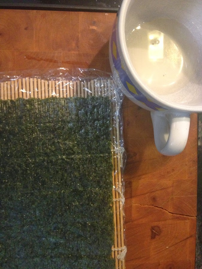 3. Humedecemos levemente las manos en agua avinagrada y salpicamos la hoja de NORI.