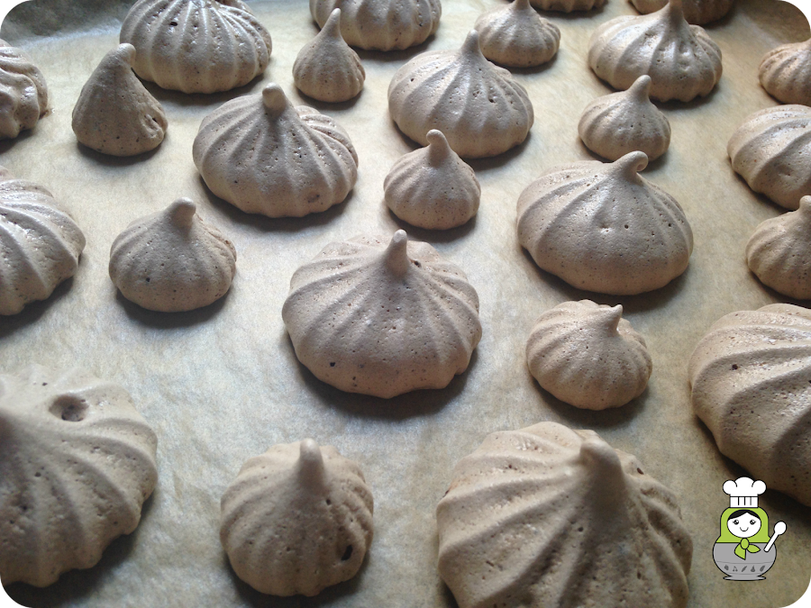 Si queremos darle un pequeño toque de color basta con utilizar colorante alimentario en gel o también podéis aromatizarlos con algún sabor al gusto: limón, café o, como hemos hecho nosotras, cacao en polvo. Disponemos el merengue en la manga pastelera con boquilla de estrella y hacemos los suspiros directamente sobre la bandeja del horno recubierta con papel sulfurado.