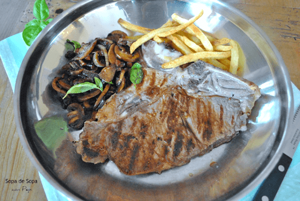 Servir el T-Bone acompañado de los champiñones y las patatas.