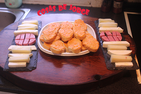 Cortamos las cortezas de las lonchas de queso y cortamos este a bastoncitos, como podéis observar en la foto.