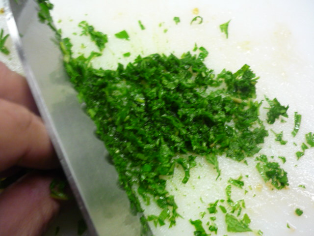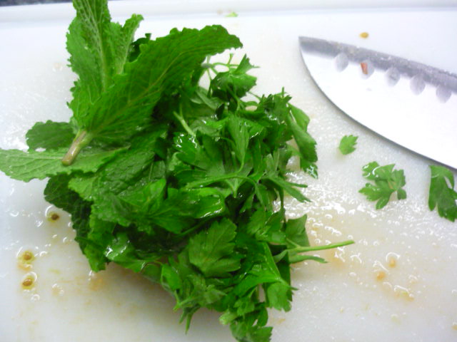 5.- También picamos el perejil y la hierbabuena y lo añadimos.