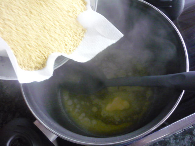 1.- Derretir la mantequilla en una cacerola y agregamos el cous-cous (sémola)