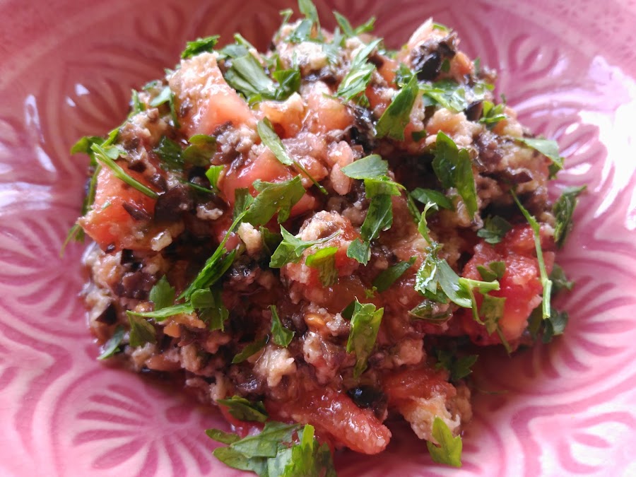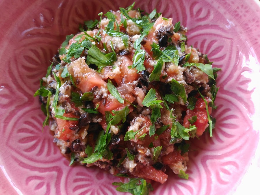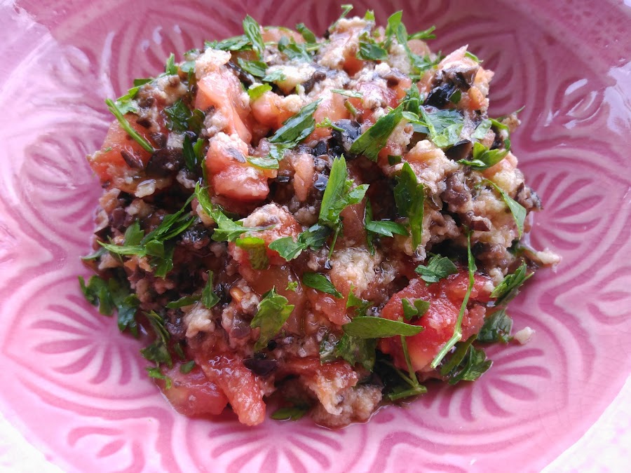 - Colar (si ha soltado agua el tomate) y servir en una bandeja con un chorrito de aceite, vinagre, sal y el perejil espolvoreado.