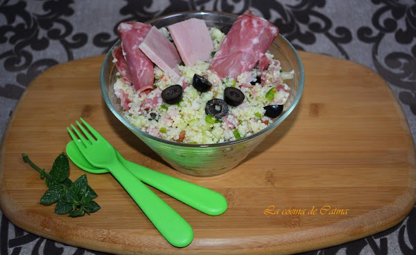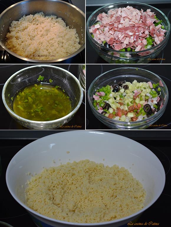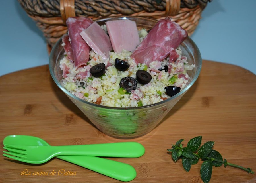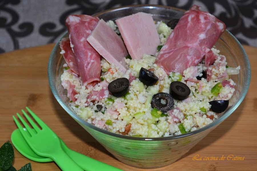 Cortar las aceitunas en rodajas, el jamón y el salchichón en cuadraditos reservando 3 rodajas de cada uno para decorar. Añadir los tomates, el pimiento, la cebolla y el pepino cortados en cuadraditos pequeños, salpimentar e incorporar al bol donde está el couscous, regar con la emulsión, mezclar bien y cubrir con un film transparente y guardar en el frigorífico al menos tres horas.