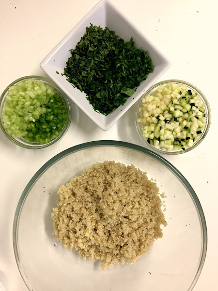 Tan fácil como cortar todas las verduras a brunoise y picar las hierbas mientras cocemos la quinoa con el doble de cantidad de agua con un poco de sal hasta que este blanda.