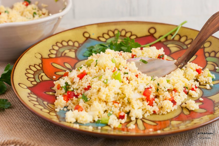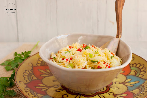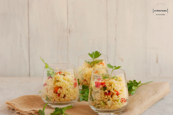 El Tabulé o tabbouleh es una ensalada de Oriente Medio muy conocida. La original, libanesa, lleva trigo bulgur en lugar de cous cous, el cous cous es mucho más fácil de encontrar por lo que el tabulé como ensalada de cous cous se ha estandarizado en nuestro país. Y no es para menos, ya que se trata de una ensalada muy veraniega, fácil de preparar, y que, tomada fresquita, es muy refrescante y poco calórica. Fue hace ya muchos años cuando probé por primera vez el tabulé o ensalada de cous cous en casa de mi amiga Lola, y aún no la tenía publicada en el blog, por lo que he aprovechado para volver a hacerla y publicarla. He preparado una versión muy light, una ensalada básica a la que se le pueden añadir más ingredientes, como pasas, comino, atún, hierbabuena, aceitunas negras....., al gusto del consumidor.