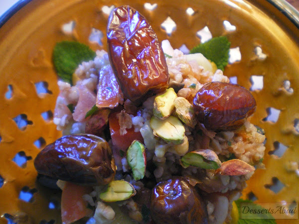 Una vez cocido el bulgur, picamos muy finamente las verduras, las aceitunas, los dátiles y los pistachos.