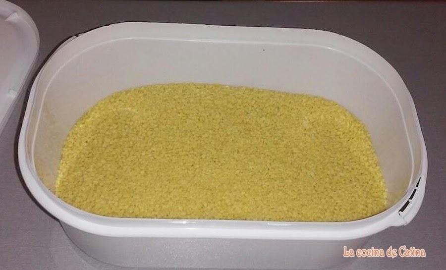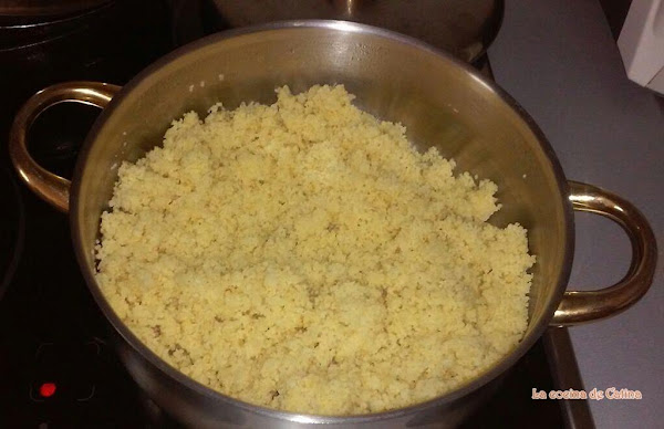Preparación:Ponemos agua a hervir, (un dedo en una olla de culo ancho), cuando hierve añadimos la sémola. Removemos y se deja reposar 5 minutos, hasta que absorba el agua.