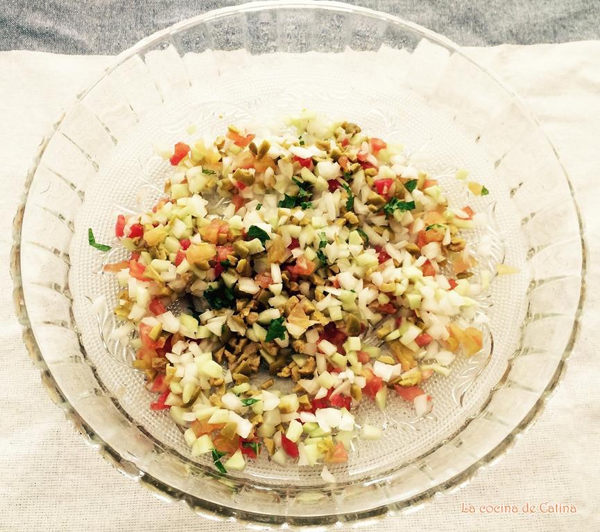 Ponemos la sémola en un bol y aliñamos con limón escurrido, sal y aceite de oliva. Luego añadimos el pepino, tomate, cebolla, perejil, pasas y la hierbabuena a trocitos.