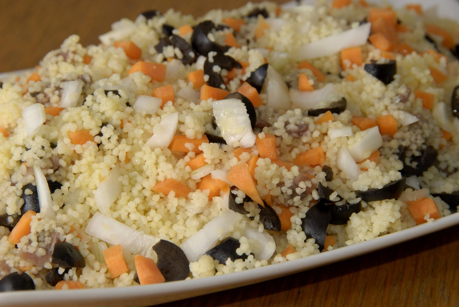 Ensalada típica de la cocina libanesa. Se pueden añadir muchas verduras. Yo ese día no añadí tomate porque no tenía y ni pimiento porque no me gusta crudo (cuestión de gustos). También añadí anchoas en conserva aunque la receta original no lleva.Las instrucciones del envase de cuscús piden cocinar con mantequilla pero yo utilizo aceite de oliva para una receta "mas sana".