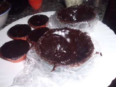 Funde el chocolate con la leche poco a poco y con una brocha pinta de chocolate los moldes. Deja que enfrie el chocolate y vuelve a pintar, asi al menos 4 ó 5 veces. Mete las tartaletas en el frigo, cuanto mas frio esté el chocolate mejor se desmolda.