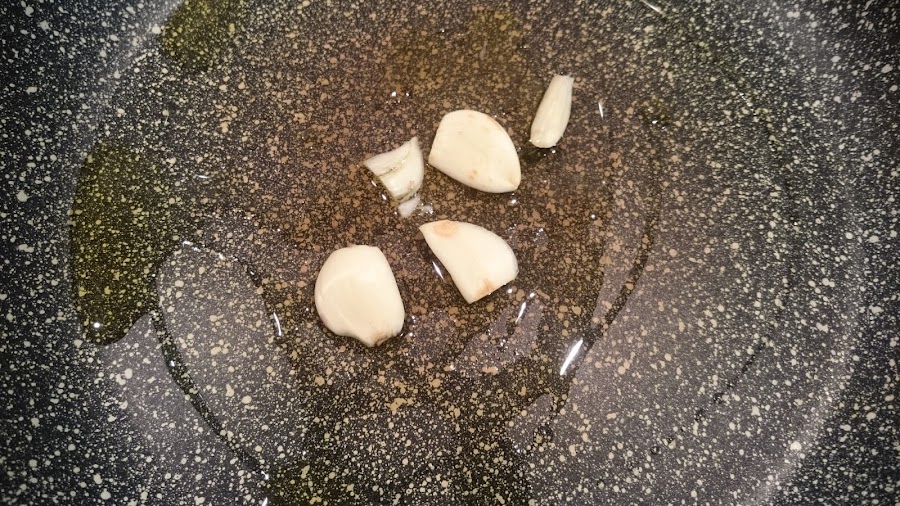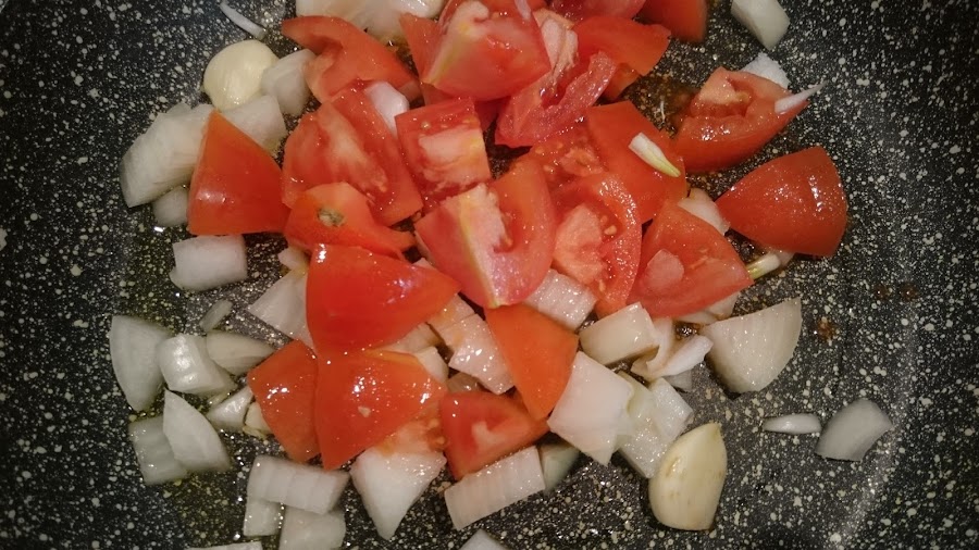 En esa misma sartén añadimos un poco más de aceite y echamos los ajos enteros (o parcialmente troceados), la cebolla y el tomate. Sofreímos el conjunto hasta que se ablande.