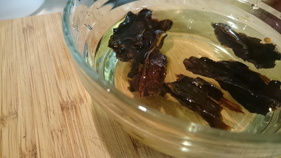 Por un lado vamos a poner el chile a calentar en una sartén con un poco de aceite. NOTA: Yo he usado chile pasilla que me trajeron de México, pero en la variedad y en la despensa está el gusto. Usad el que más os plazca: habanero, jalapeño, guajillo, mulato... Recordad que esto es para paladares atrevidos, así que medid con prudencia. Volvemos al chile, una vez lo calentamos bien por ambas caras lo sacamos, le retiramos las semillas y lo ponemos en un bol con agua fría unos 15-20 minutos.
