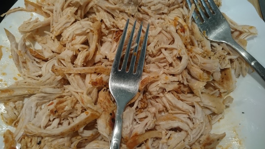 Pasado el tiempo sacamos la pechuga - con cuidado extremo de no quemarnos, que no nos interesa nada - y la vamos a ir deshilachando con ayuda de dos tenedores. En este punto la pechuga estará muy tierna y el trabajo os debería resultar muy fácil. Devolvemos las tiras de pavo a la sartén, mezclamos todo, rectificamos de sal si hiciera falta y dejamos reposar.