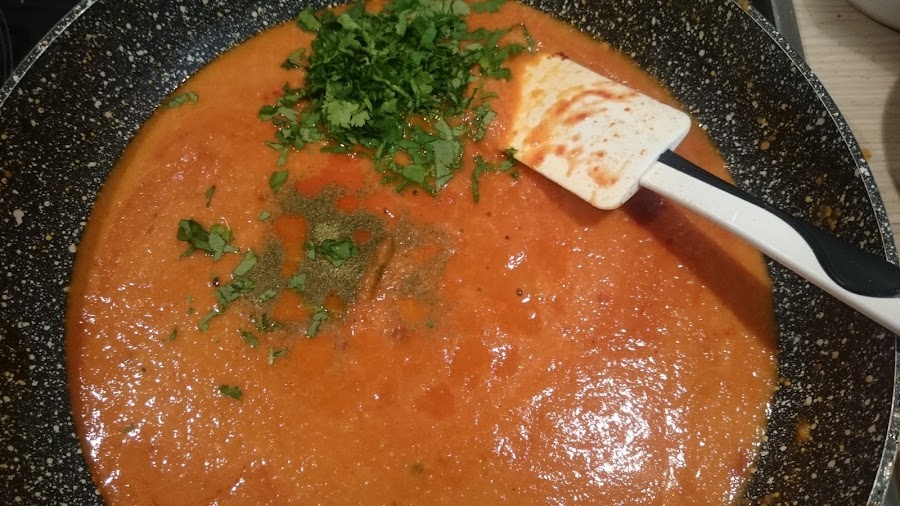 Vertemos la salsa resultante de nuevo en la sartén y calentamos. Añadimos orégano, cilantro picado y sal. Mezclamos y dejamos que los aromas nos vayan inundando los pulmones...