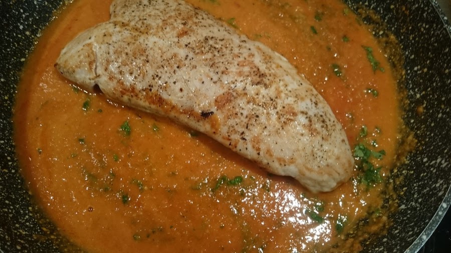Incorporamos la pechuga de pavo a la salsa y tapamos. Dejamos cocer a fuego medio-bajo durante 20 minutos. Con calma, sin prisa, a su ritmo...