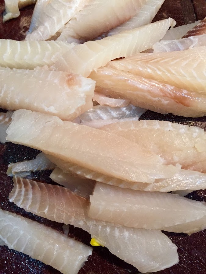 1.- Cortas los filetes del pescado en tiras de unos 7 a 10cm. de largo condimentas con pimienta, sal de ajo y sal al gusto.