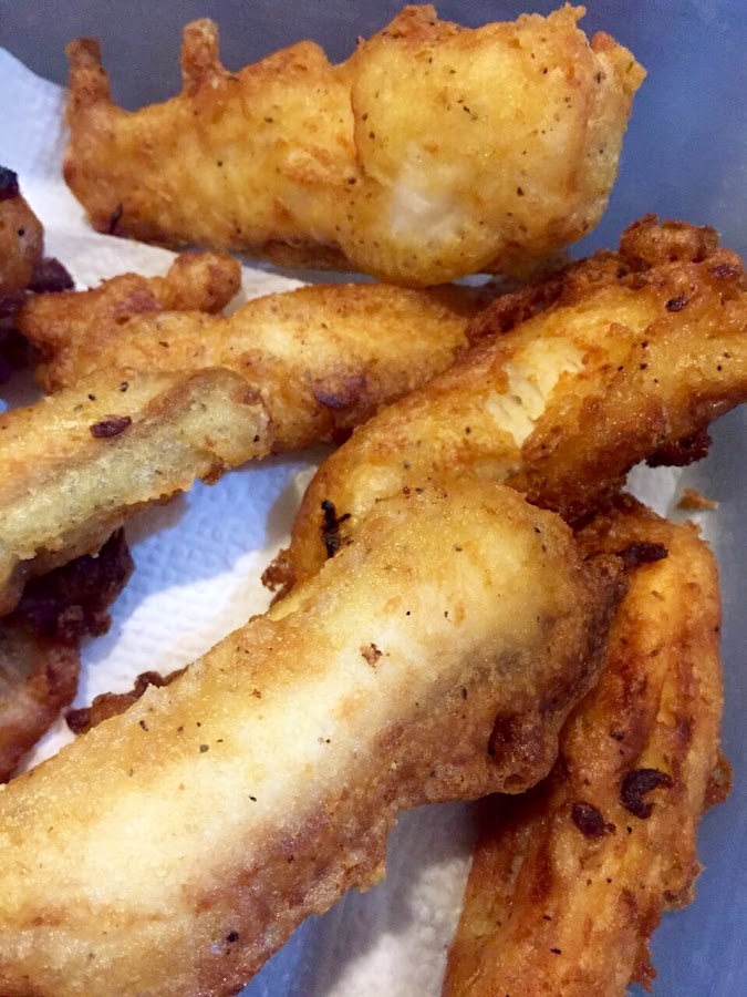 3.- Una vez que tienes todo listo empezamos a freir el pescado, en una sarten pones el aceite y agregas los dos dientes de ajo previamente picados, una vez que se doran los retiras, esto para dar sabor al aceite hecho esto, tomas las tiras de pescado las pasamos por la mezcla que hicmos en el paso anterior, ya que esten bien cubiertas las retiramos y las ponemos a freir hasta que tomen un color dorado uniforme, despues los colocamos en un recipiente con papel absorbente, los dejamos hasta que el exceso de aceite quede en el papel absorbente.