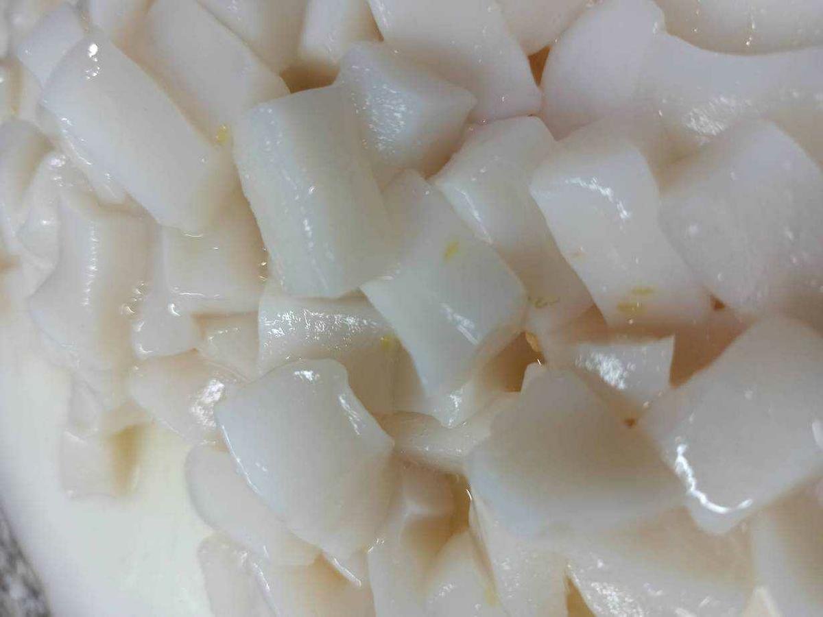 En primer lugar cortaremos las tiras de calamar en dados pequeños con un cuchillo muy afilado.