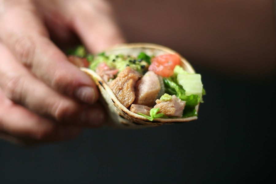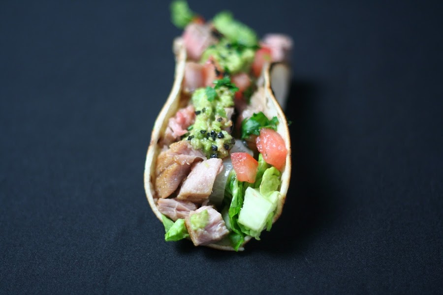 Ponemos las tortitas en la sartén para que se calienten y formamos los tacos poniendo en primer lugar una base de lechuga, la cebolla por encima, después el tomate, el atún y por último una cucharadita de guacamole. Espolvoreamos con sal negra y disfrutamos de estos deliciosos y originales tacos.