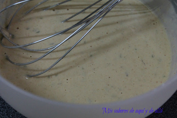 In a bowl, put the flour, yeast, paprika, oregano, garlic, mustard, salt and pepper and add beer to obtain a dense and homogeneous batter. (About half a can of beer)