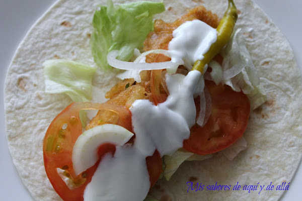 We take a flour or corn tortilla, according to taste, we put a few pieces of cod in the middle, add the vegetables and watered with our yogurt sauce and add the peppers or pickles.