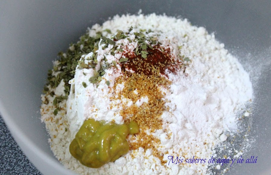 En un bol, ponemos la harina, la levadura, el pimentón, orégano, ajo, mostaza, sal y pimienta y añadimos cerveza hasta conseguir una mezcla densa y homogénea. ( Alrededor de media lata de cerveza)