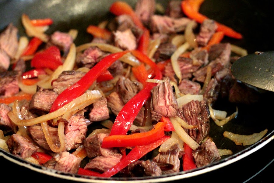 Cortamos la cebolla y el pimentón y los ponemos en un sartén antiadherente con el aceite. Cuando este cristalizando la cebolla-no dejes de mover para que no se te pegue y se cocine de forma pareja, añadimos el wiski y cuando este hirviendo agregamos la carne cortada en tacos o cuadritos que es lo mismo en bronuoise jajajaja?hombre un poquito de glamour en el vocabulario gastronómico?jajaja?mola, queda pizpireta?ainx que me despisto mejor sigo con la explicación, añadimos la carne con, el ajo, el comino, el cilantro y removemos. En este punto el sartén seguro que esta súper caliente, vigila el punto de la carne.