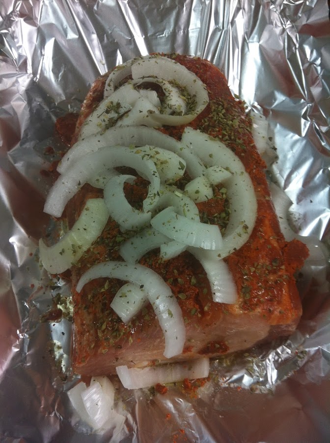 Se precalienta el horno a 180º C con calor arriba y abajo. Se pone en una fuente de horno sobre un papel de aluminio el lomo de cerdo cubierto con la pasta de achiote (si no tienes el achiote puedes poner ajo picado con especias), con una cebolleta cortada en tiras y con orégano. Se cierra el papel de aluminio como si fuera un paquete. Se hornea durante 1 hora u hora y cuarto.