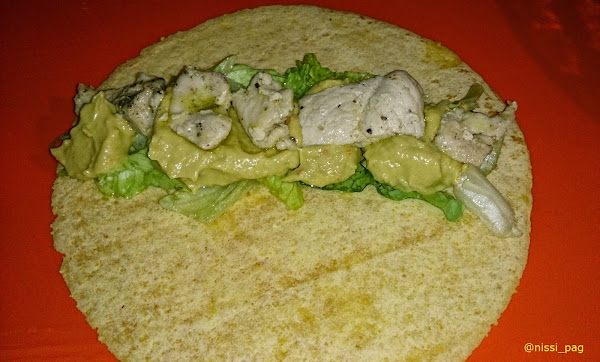 Ya con el pollo en su punto, procederemos a montar los tacos, para hacerlo, pondremos un poco de lechuga en el centro del taco, sobre esta una dosis generosa de guacamole para al final coronarlo con las tiras de pollo que creáis oportuno, tal que así: