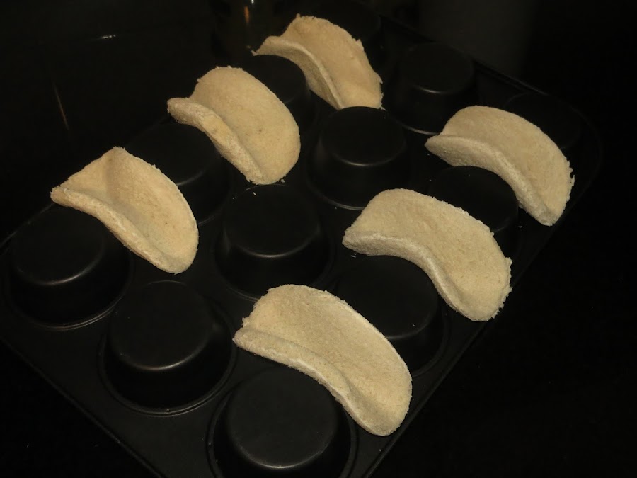 Ahora cogemos nuestras rebanadas de pan de molde, las estiramos con un rodillo y le damos forma de tacos, las colocamos en una bandeja para magdalenas al revés, tal y como veis en la foto y lo metemos al horno durante 8 minutos a 180º.