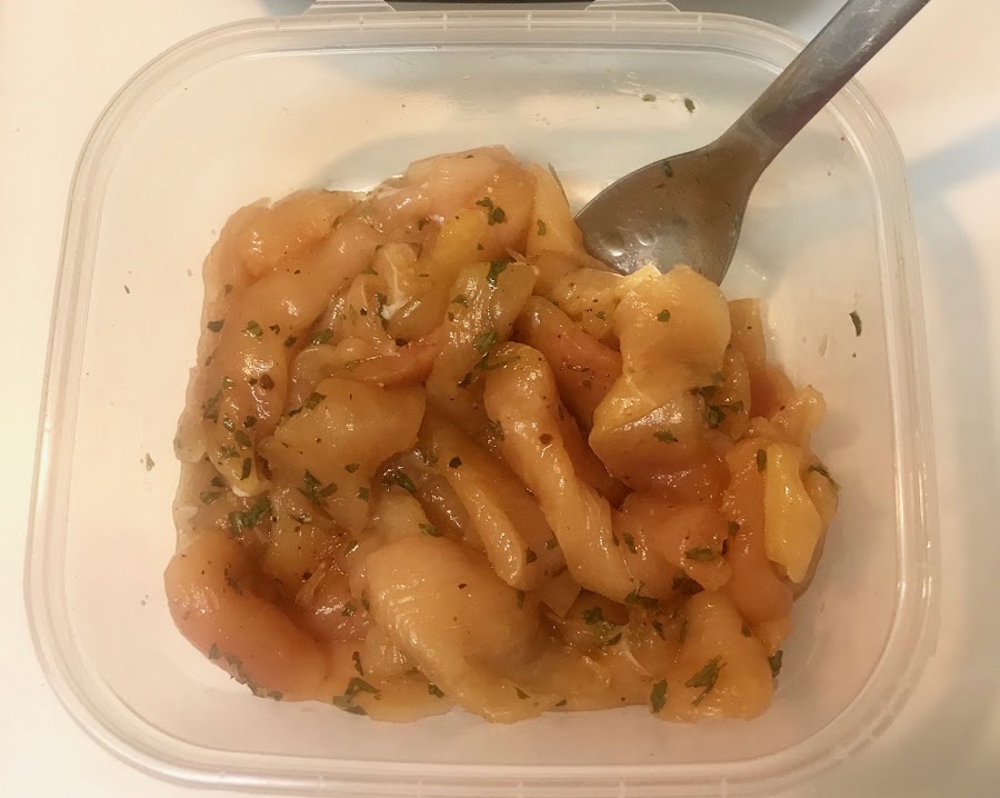 Corta el pollo en tiras y pon la sal y pimienta negra al gusto, el ajo en polvo, el perejil y 1 cucharada de aceite, mezcla bien y reserva.
