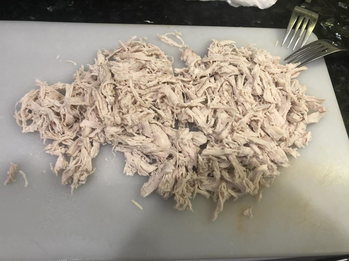 2. Sacamos la pechuga del agua y la colocamos en una tabla para cortar alimentos. Si no tenemos el utensilio especifico, la vamos deshilachando tirando de ella con dos tenedores, uno en cada mano. Así con toda la pechuga, hasta que nos quede bien deshilachada. Reservamos de momento.