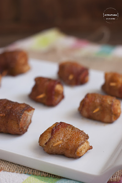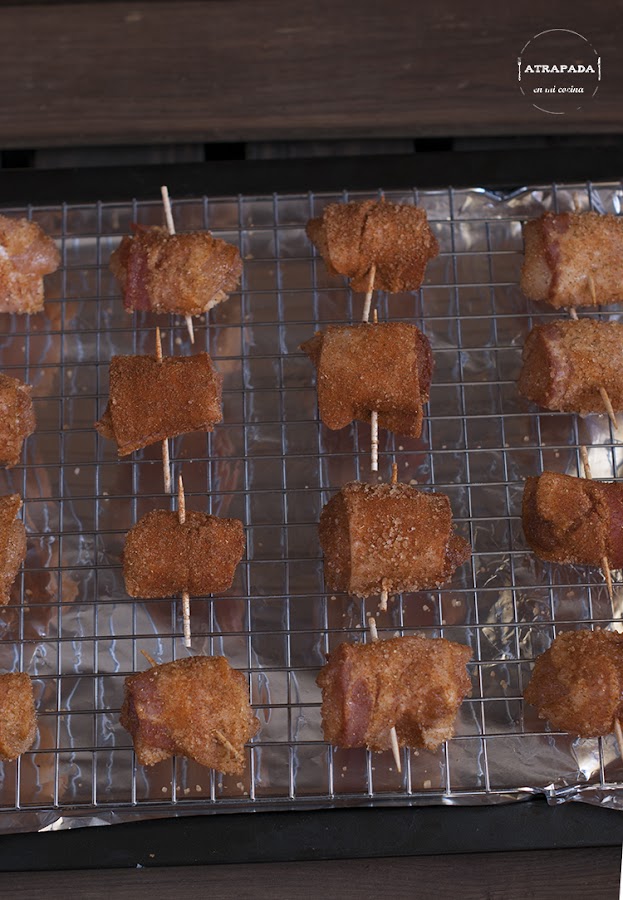 Cuando vi esta receta en Pinterest la guardé inmediatamente en recetas pendientes. El bacon es mi perdición, me encanta todo lo que lleve bacon, y eran muy sugerentes estos tacos. Sólo he hecho una variación con respecto a la receta original, ya que no tenía en casa chile en polvo y lo he sustituido por un poco de pimentón picante. Se trata de unos tacos de pechuga de pollo envueltos en bacon y rebozados en una mezcla de azúcar moreno, comino molido y pimentón picante. El resultado es espectacular y una opción ideal para llevar a cualquier reunión de amigos o para una cena o almuerzo de picoteo.