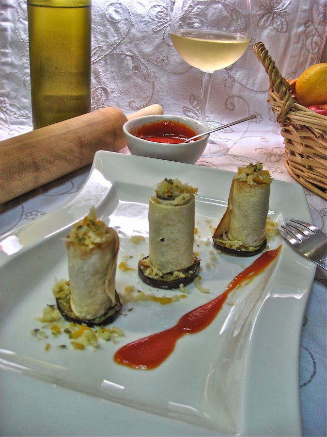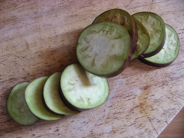 4º " Cogemos la berenjena y la cortamos a rodajas, las freímos y reservamos encima de papel de cocina.