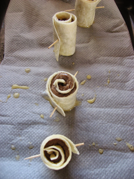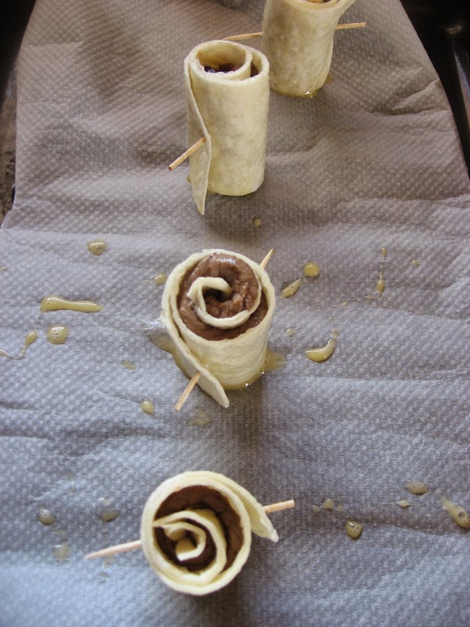 3º " Los ponemos en la bandeja del horno, y los pintamos con huevo. Los colocamos en el horno a 180º, no pongo el tiempo porque dependerá del horno pero como no es mucho, tenemos que vigilar para que cuando comiencen a quedar dorados los retiremos rápidamente.