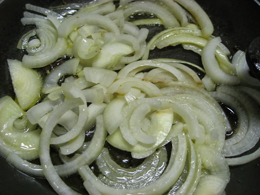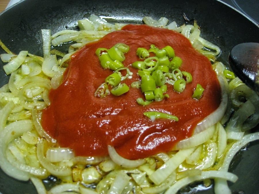 2º " Cortamos y freímos los tomates, una vez fritos los añadimos a la cebolla. (podemos utilizar tomate frito, es más rápido)