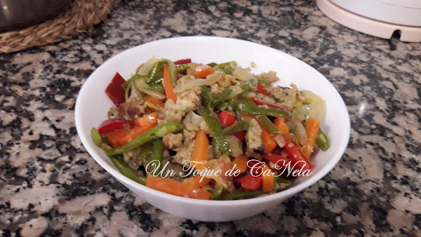Saltear todos los ingredientes a fuego medio, removiendo de vez en cuando para que no se quemen hasta que los tengáis al gusto. En casa nos gustan al dente. Reservar.