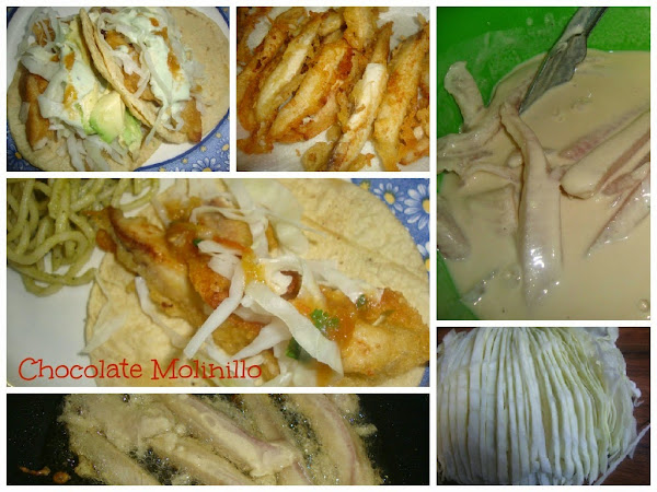 Hace algún tiempo llegó mi hermano Paco a la casa al medio día, con esta deliciosa idea para hacer la comida, prácticamente yo me senté a verlo cocinar y el resultado fue fantástico, preparó unos deliciosos Tacos Presidente, consiste en rebozar tiritas de pescado freírlas y servirlas sobre una tortilla de maíz calientita con trocitos de col salsa al gusto, aguacate, mayonesa y bueno, uno les puede agregar casi lo que se nos antoje... pues de estos tacos existen muchas variantes, creo que cada quien tiene su manera particular... aquí la receta...