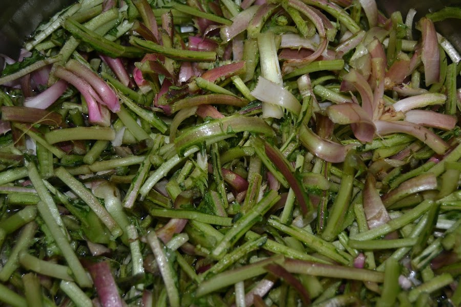 Enseguida echamos las tagarninas escurridas dejando un poco de agua para terminar de hacerlas.
