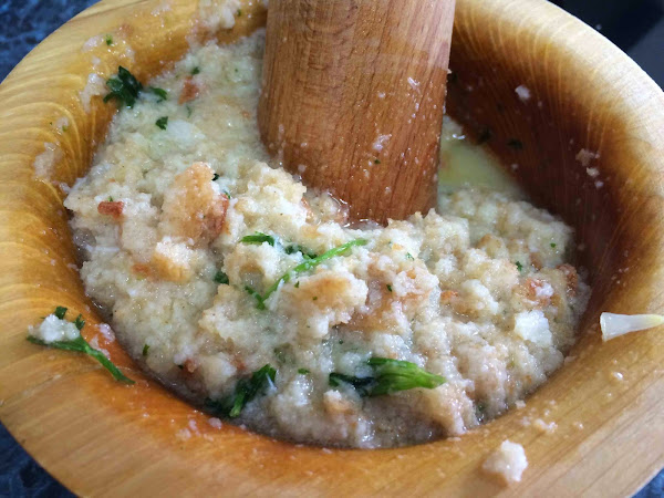 Hacemos un "majaíllo" con el pan, los dientes de ajo y el perejil fritos.