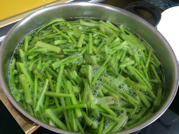 Ponemos agua a hervir con un pellizco de sal y cocemos las tagarninas durante 15 minutos.