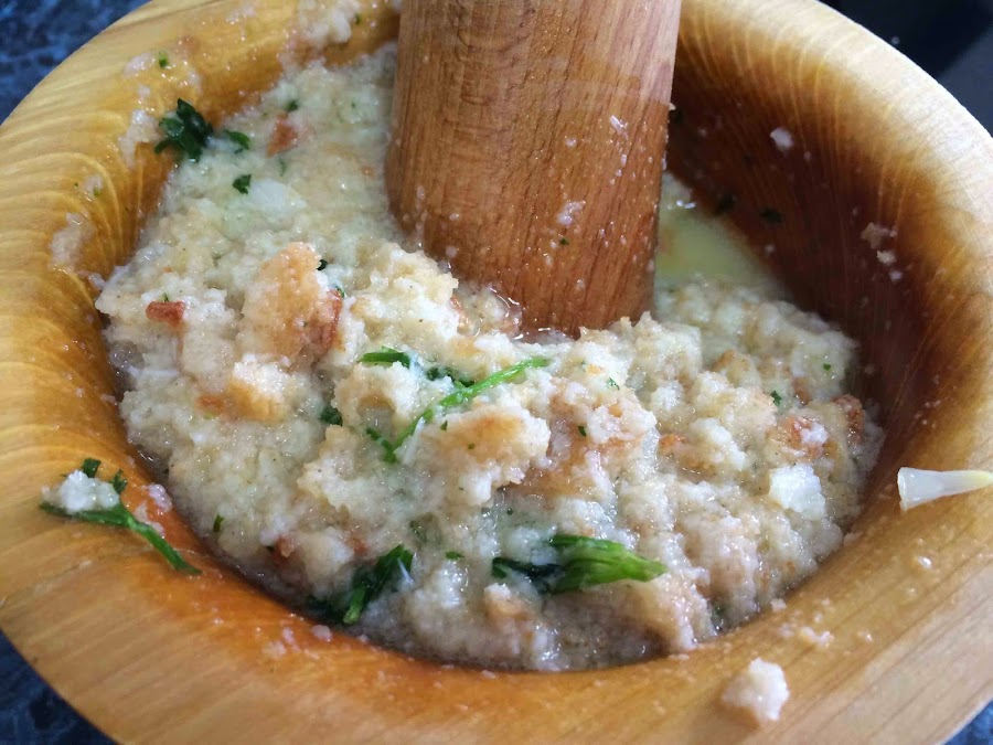 Añadimos un poco del agua de haber cocido las tagarninas al "majaíllo" y trabajamos con el mortero.