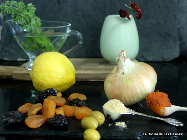 Incorpora a la tagine, añade un poco de agua, caldo o lo que hayas utilizado en la sartén para recoger todos los jugos, vierte en la tagine. Cubre con agua/caldo e introduce en el horno que has precalentado a 180º durante media hora.