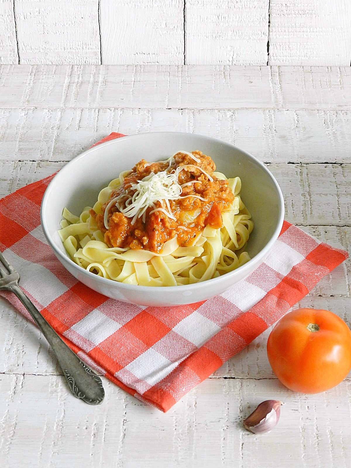 Servimos la pasta con la salsa boloñesa por encima y con queso rallado espolvoreado por encima..