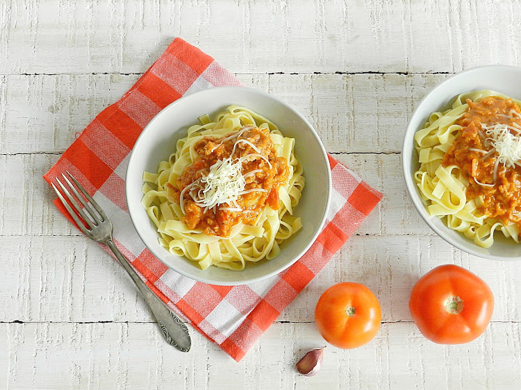 Servimos la salsa por encima o ya mezclada, como prefiráis y con queso rallado espolvoreado por encima.